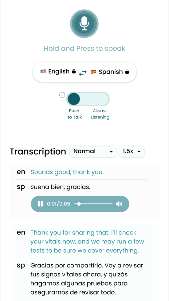 Instant translation for triage, intake, bedside care, and telehealth.